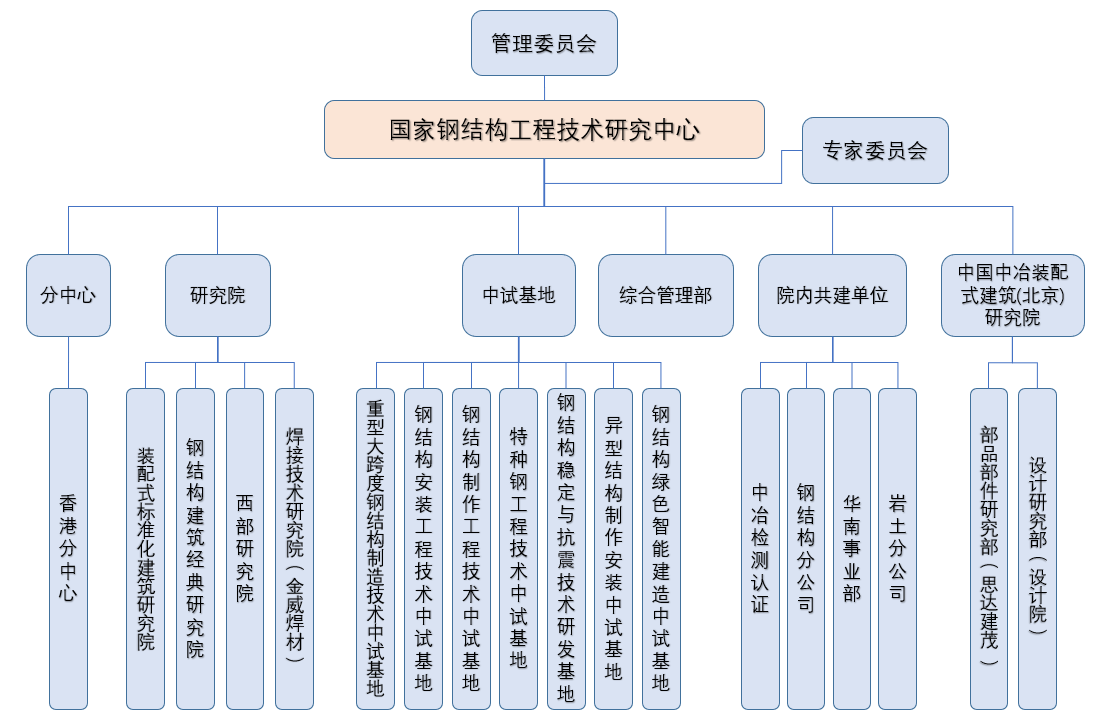 钢结构中心的组织机构主要包括1个实体管理部门,1个分中心,4个研究院,7个中试基地,4家院内共建单位,1个中国中冶研究院。这些分中心、研究院、中试基地的建成使钢结构中心与本领域的知名企业、学校、研究机构建立了紧密长期的合作关系,在钢结构工程技术领域的研发、中试及生产任务中发挥着重要作用,有力地推动了新技术、新产品的产业化进程。
