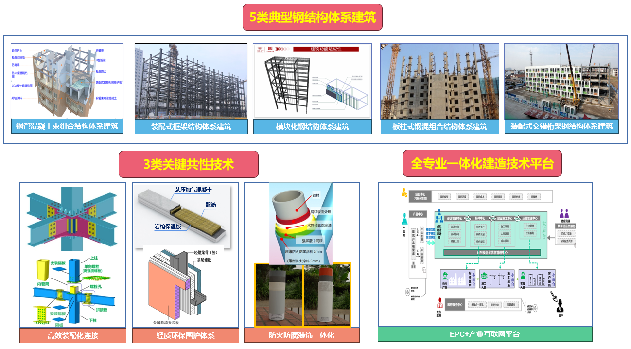 (1)钢结构建筑产业化关键技术:研发了剪力墙、框架、模块化、板柱结构和交错桁架等5类典型钢结构体系建筑产业化集成技术,重点突破了钢结构建筑产业化需重点突破的高效装配化连接、轻质环保围护体系、防火防腐装饰一体化3类关键共性技术,开发了全过程、全专业协同一体化智能建造技术平台。